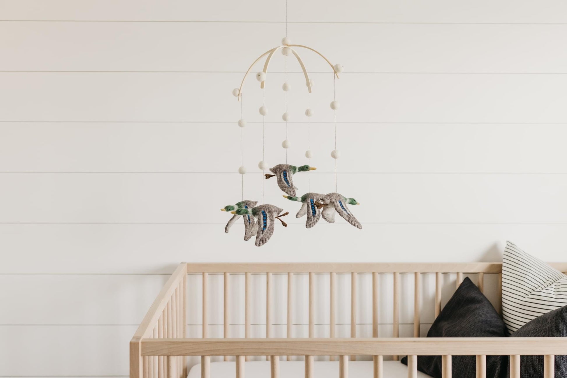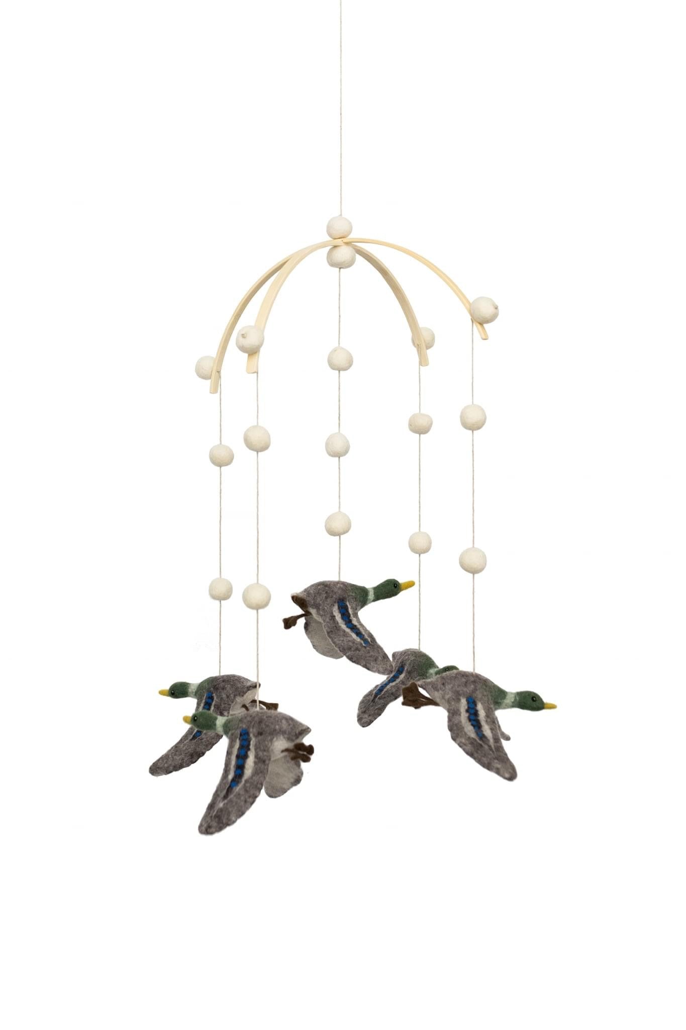 DETAILS: Our whimsical mobiles are designed to soothe as well as to encourage visual development without over stimulating your little one. Each of the five items on the mobile is expertly handcrafted with care and great detail by a skilled artist in Mongolia from 100% Mongolian wool felt, and suspended from a wood frame. This allows the mobile to rotate gently and silently without disrupting your baby’s sleep.