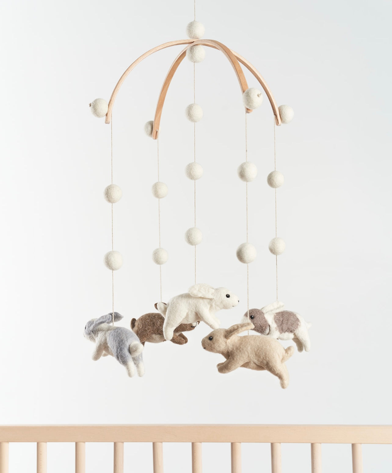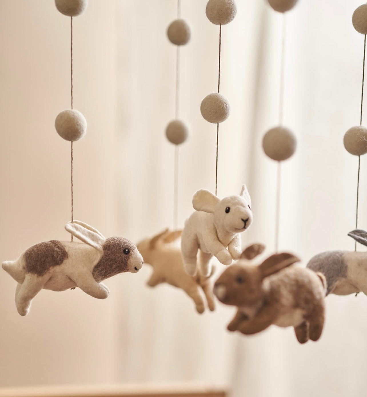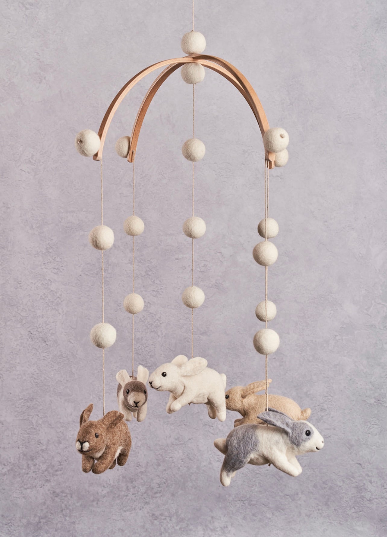 DETAILS: Our whimsical mobiles are designed to soothe as well as to encourage visual development without over stimulating your little one. Each of the five animals on the mobile is expertly handcrafted with care and great detail by a skilled artist in Mongolia from 100% Mongolian wool felt, and suspended from a wood frame. This allows the mobile to rotate gently and silently without disrupting your baby’s sleep.