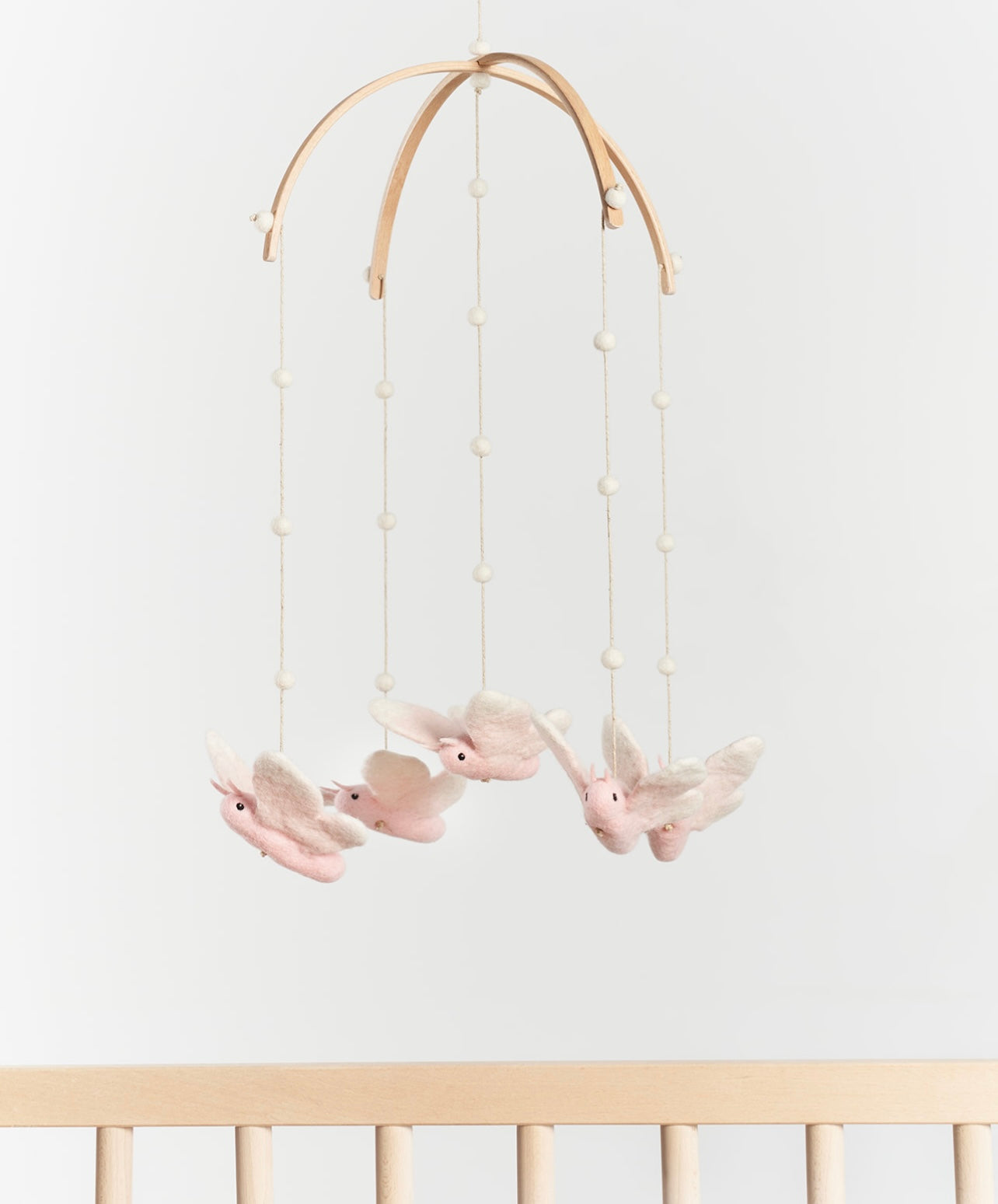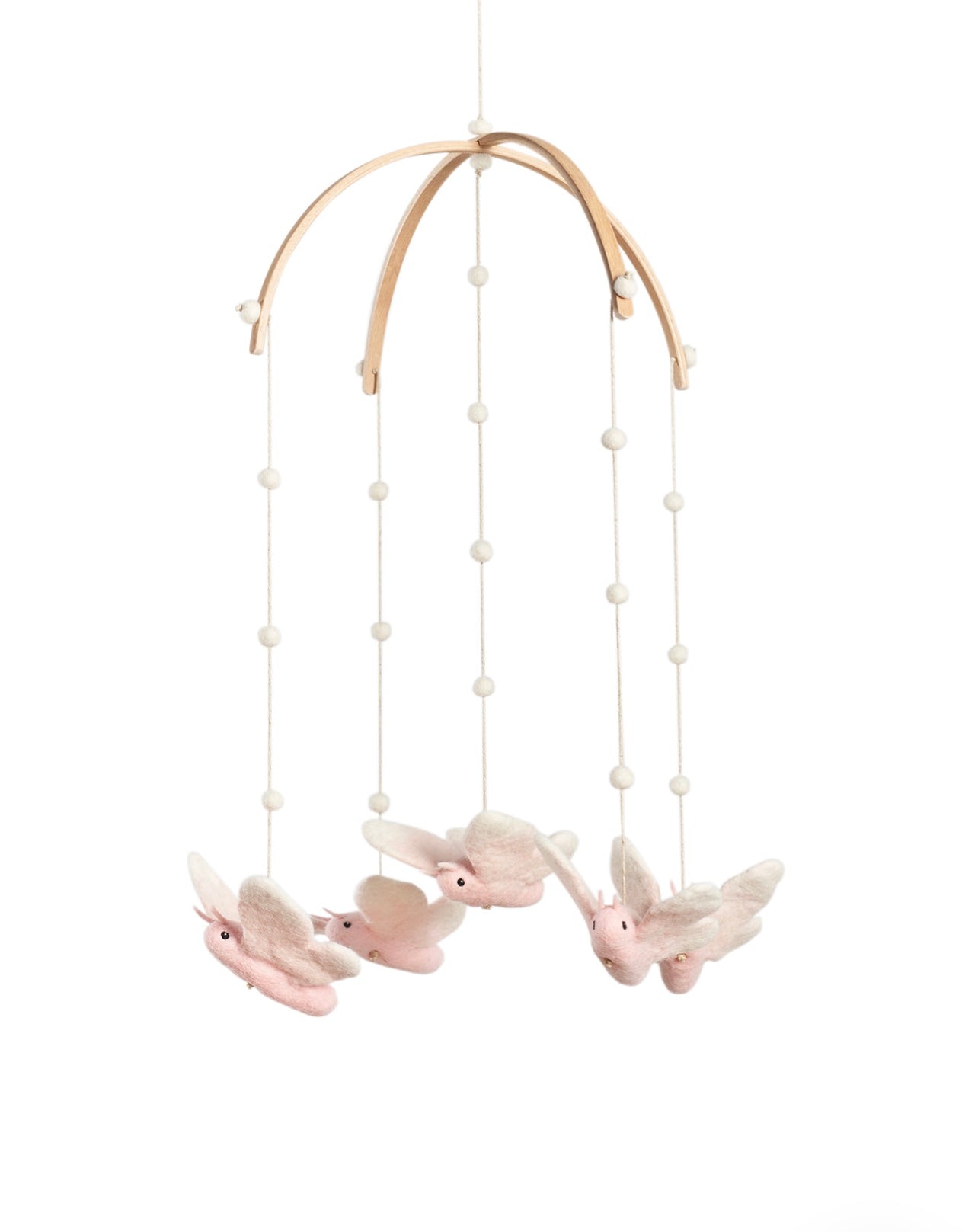 DETAILS: Our whimsical mobiles are designed to soothe as well as to encourage visual development without over stimulating your little one. Each of the five animals on the mobile is expertly handcrafted with care and great detail by a skilled artist in Mongolia from 100% Mongolian wool felt, and suspended from a wood frame. This allows the mobile to rotate gently and silently without disrupting your baby’s sleep.