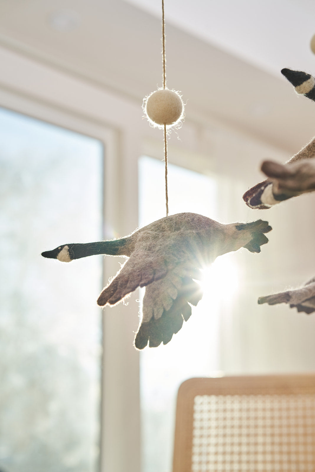 The Canadian Goose Mobile features softly floating geese, each hand-sculpted from natural wool and suspended in a gentle, balanced formation above the crib. As they drift slowly through the air, they create a steady, reassuring rhythm—offering comfort, movement, and a sense of calm.