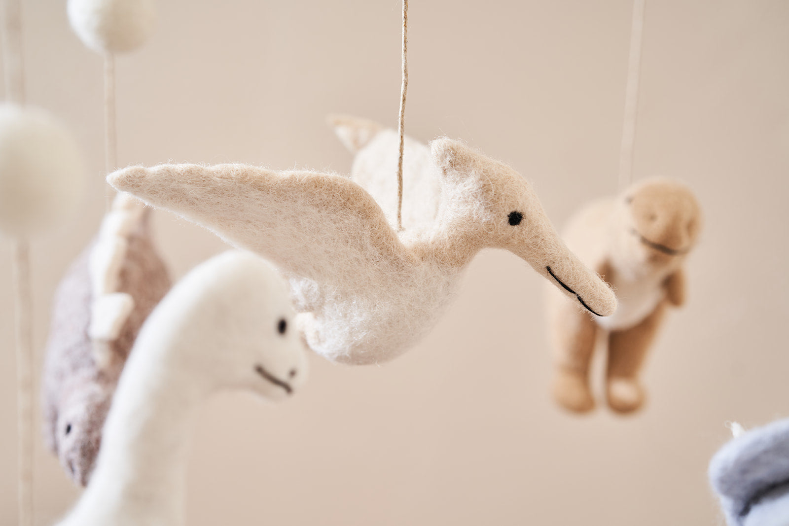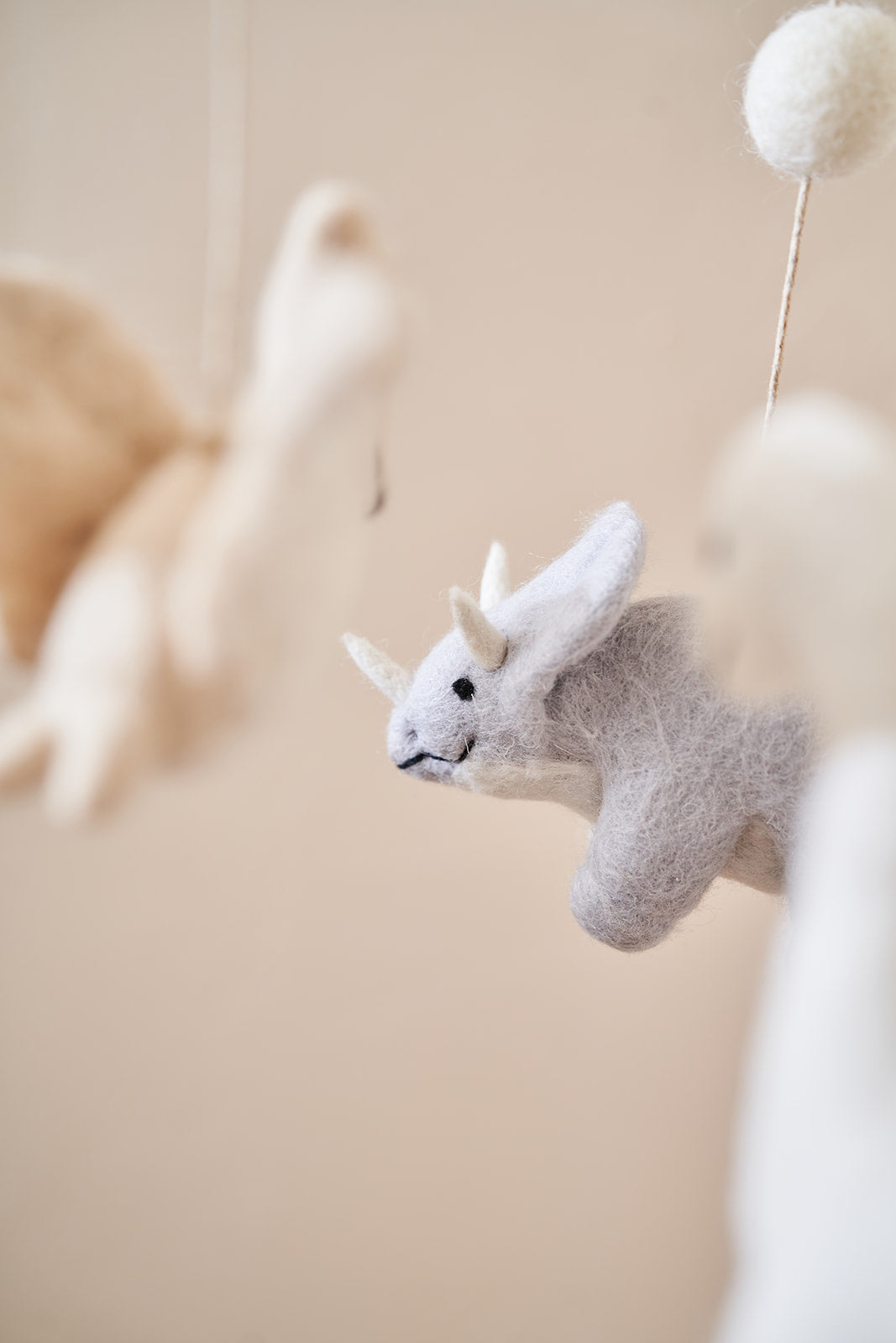 DETAILS: Our whimsical mobiles are designed to soothe as well as to encourage visual development without over stimulating your little one. Each of the five animals on the mobile is expertly handcrafted with care and great detail by a skilled artist in Mongolia from 100% Mongolian wool felt, and suspended from a wood frame. This allows the mobile to rotate gently and silently without disrupting your baby’s sleep.