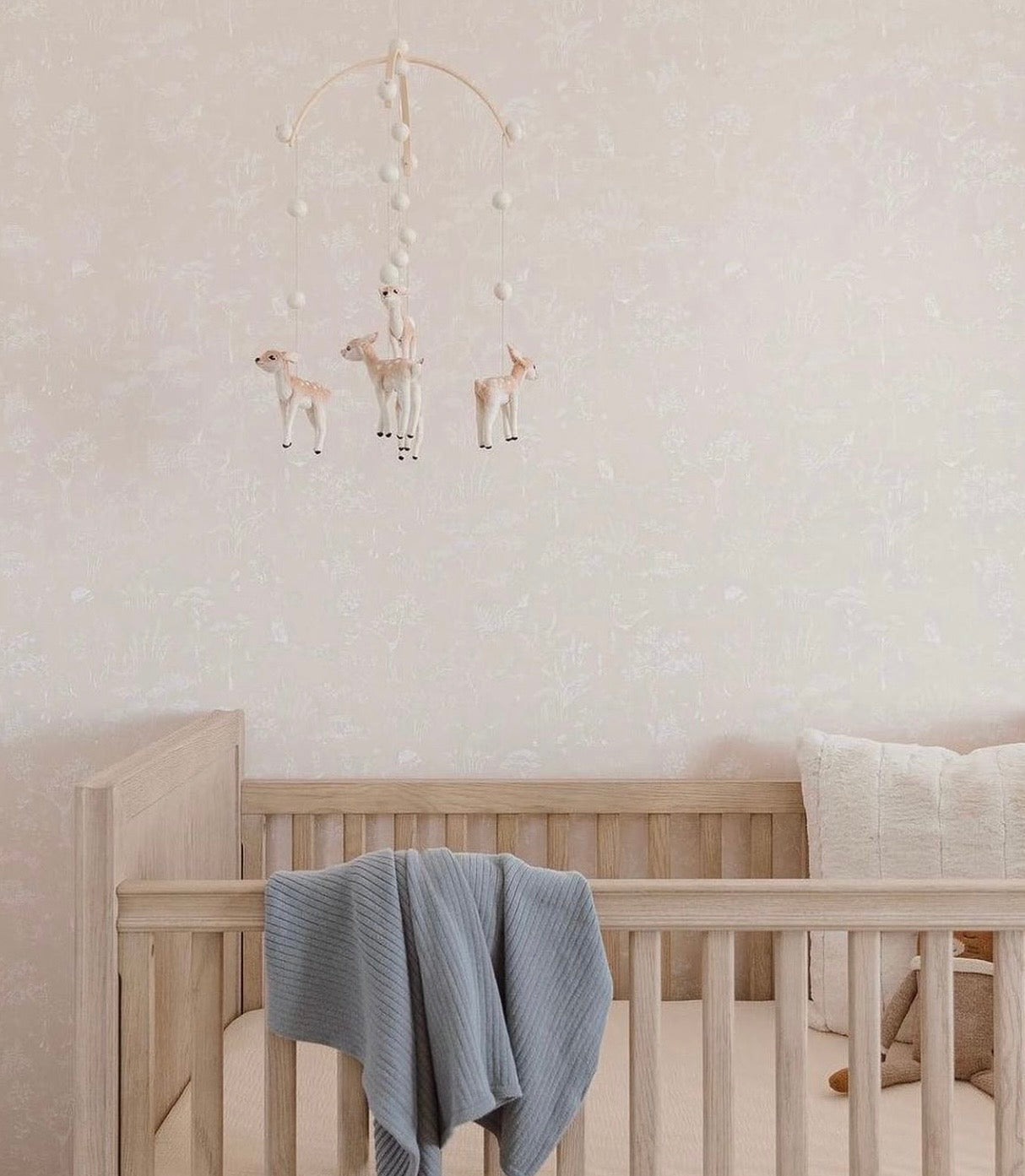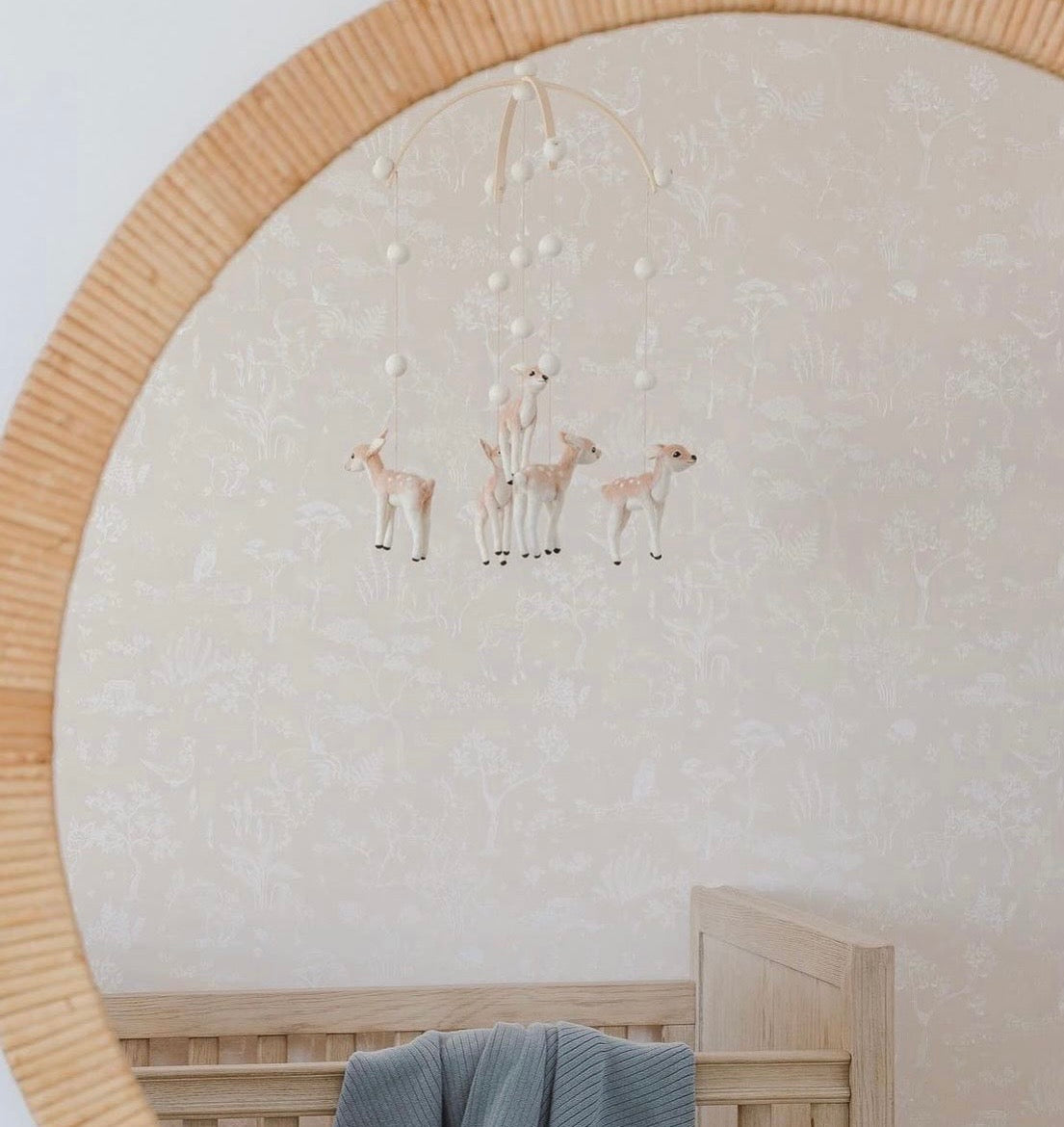 Fawn features softly floating fawn figures, each handmade slowly from natural wool felt and suspended in a delicate balance above the crib. Their gentle movement creates a peaceful rhythm, bringing comfort and quiet wonder to a baby’s space.