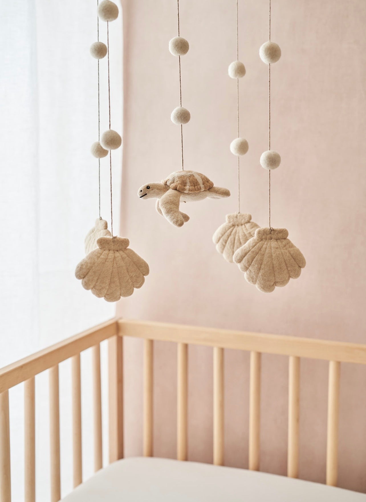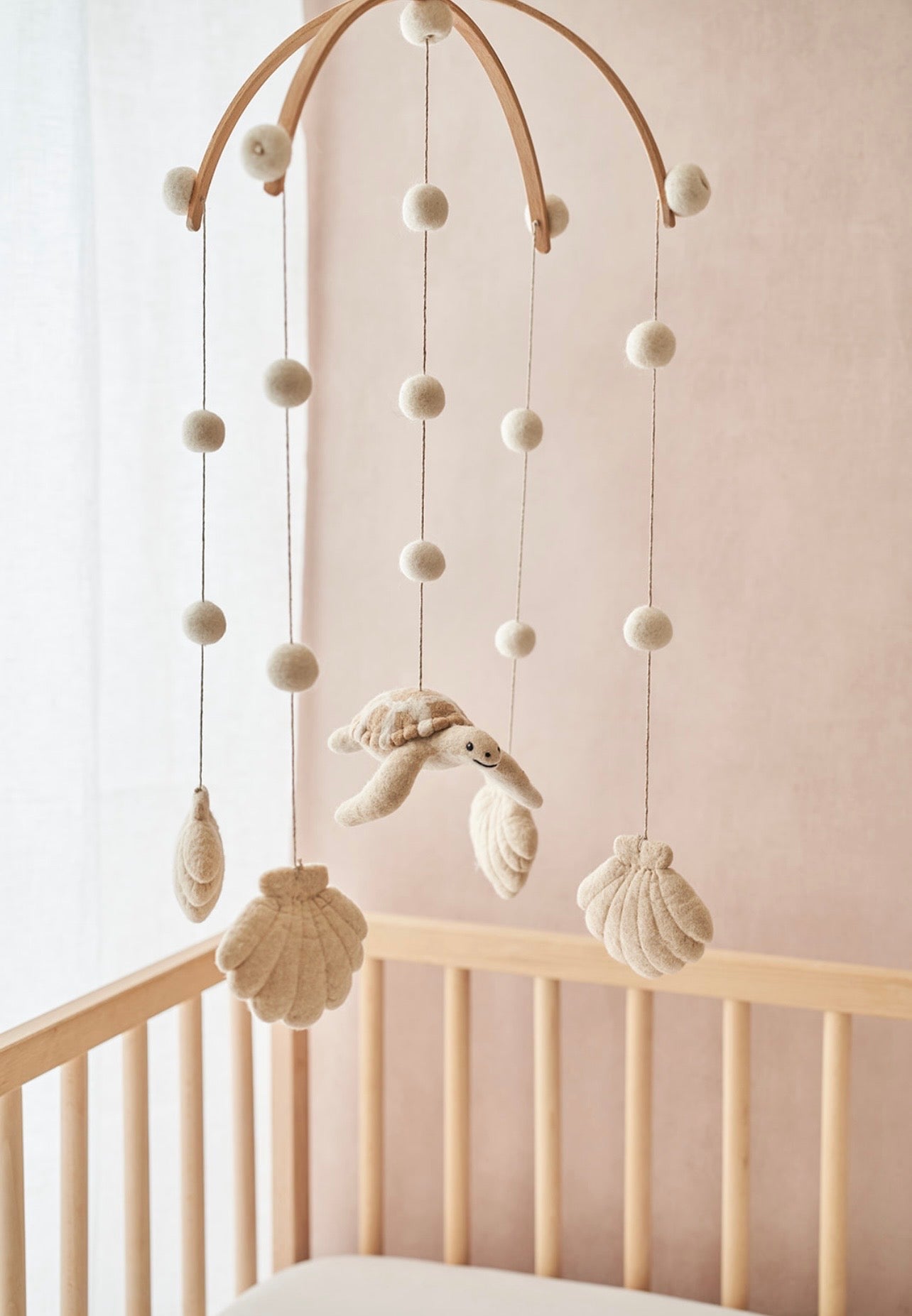 Handmade slowly, one by one, from natural wool felt, the soft turtles drift peacefully among delicate shells, encouraging quiet moments of wonder without overstimulation. The neutral palette and organic forms make this mobile a timeless addition to both modern and classic nurseries.