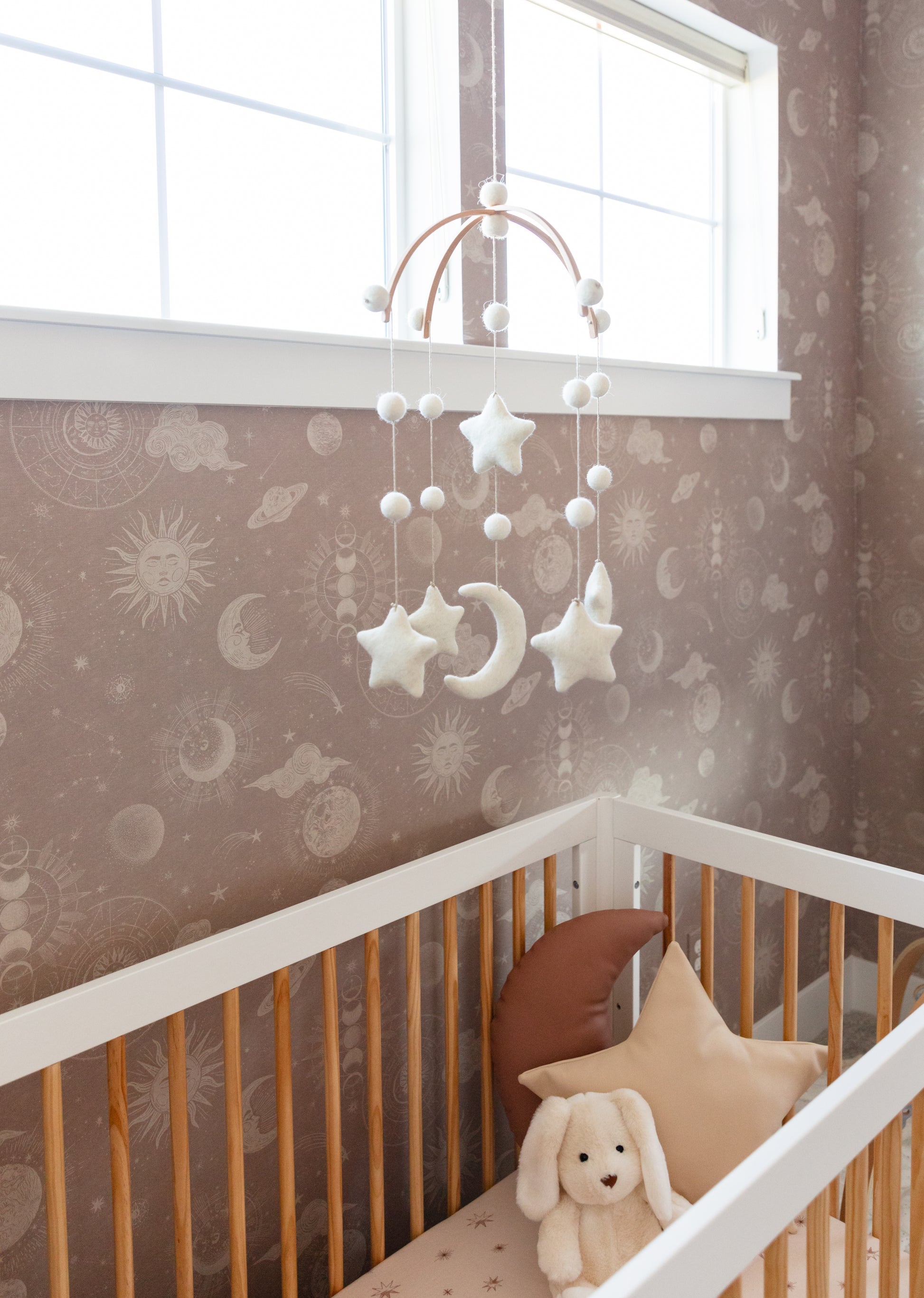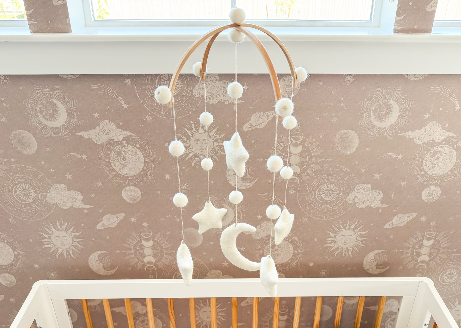 Handmade slowly, one by one, from natural wool felt, delicate moons and stars float peacefully in the air, encouraging calm moments of wonder without overstimulation. Designed to move softly and silently, this mobile brings a sense of comfort and serenity to the nursery.